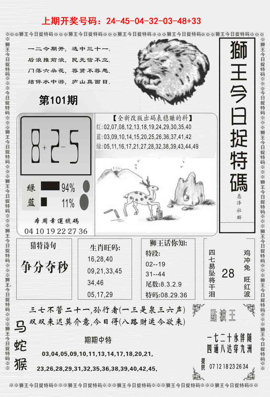 101期: 澳门六合彩红姐彩圖信封【狮王平特】每期自动更新